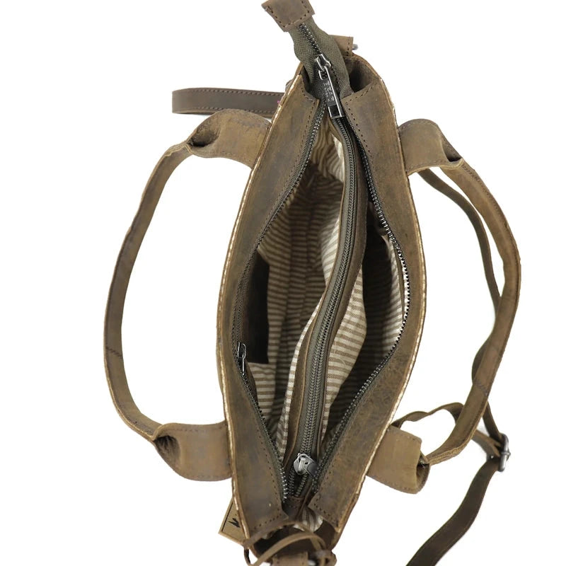 De schoudertas / shopper Katya is de kleinere uitvoering van de Thera uit de Dark Nature Collectie van Bear Design. Het is een prachtige functionele tas om al je belangrijke spulletjes in mee te nemen. De tas heeft een ruim hoofdvak die onderverdeeld is in twee vakken die gescheiden worden door middel van een breed ritsvak. Verder zitten er in de binnenzijde een ritsvak en steekvakken in de tas. De tas sluit met een rits en heeft op het achterpand een extra ritsvak. Met de lange handvatten draag je de tas gemakkelijk in de hand en (ook over een jas) over de schouder. De afneembare en verstelbare schouderband zorgt ervoor dat je de tas ook crossbody of op de schouders kan dragen.