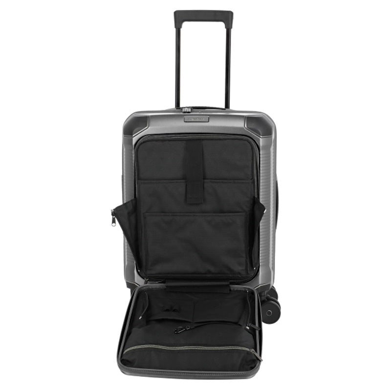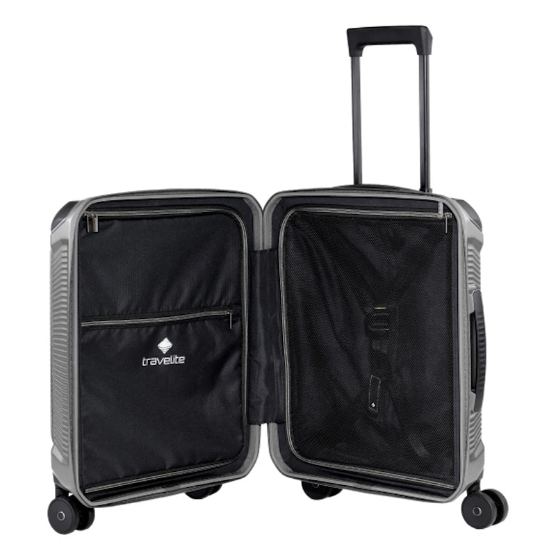 Handbagage trolley met 4 wielen uit de Millenium serie van Travelite. Dankzij het unieke voorvak met ritssluiting heb je echter alles meteen bij de hand. Of je nu je laptop, tablet, sleutels, een pen, documenten of uw instapkaart nodig heeft, je hoeft alleen maar het voorvak open te ritsen. De koffer heeft twee ruime hoofdcompartimenten die afsluitbaar zijn met een nylon divider en met inpakriemen. Het TSA-slot zorgt ervoor dat alles in je koffer veilig is opgeborgen. Gemakkelijk te vervoeren dankzij de verstelbare trekstang, spinning wielen en handvatten aan zowel de bovenzijde als de zijkant. De Millenium collectie is gemaakt van hoogwaardig polycarbonaat dat zich kenmerkt als licht, slagvast en erg sterk. Deze trolley mag mee als handbagage met de meeste vliegmaatschappijen volgens de IATA-norm. Informeer altijd voor vertrek bij je vliegmaatschappij of deze trolley ook mee mag.