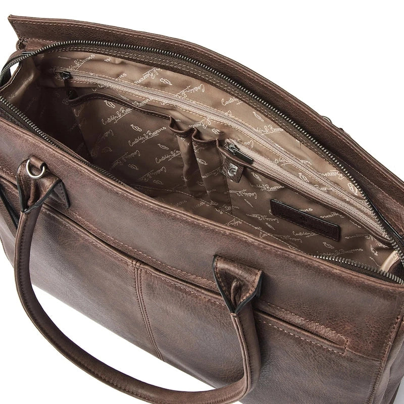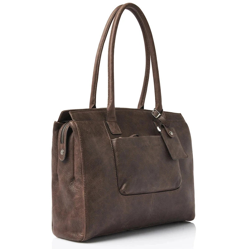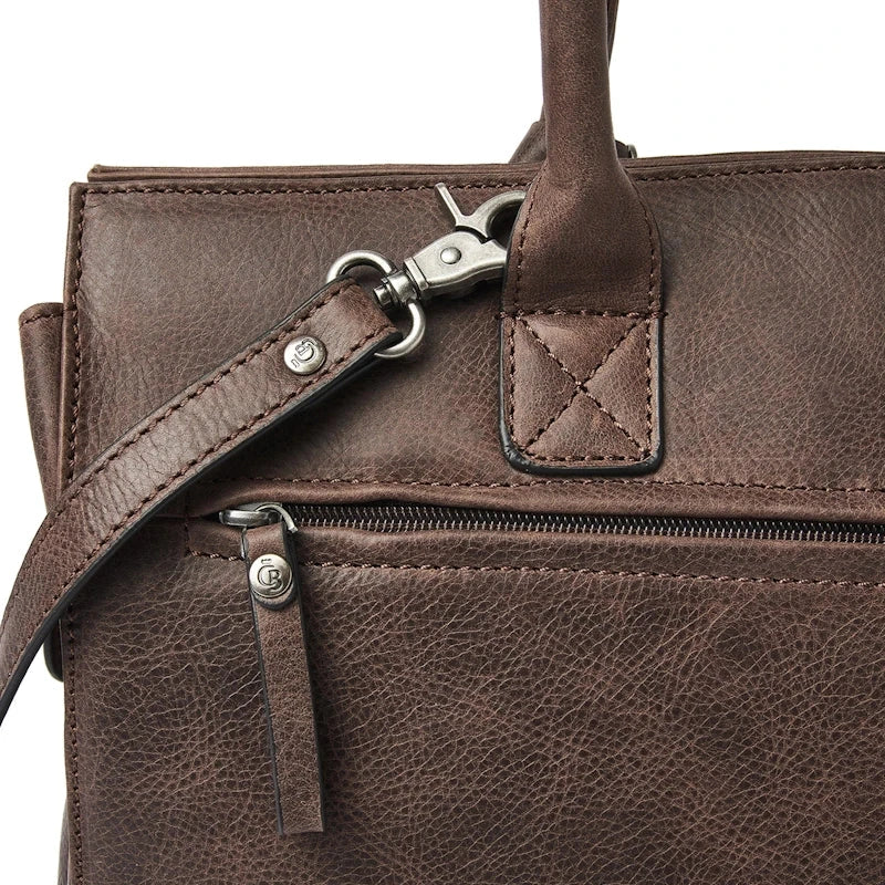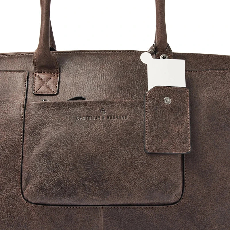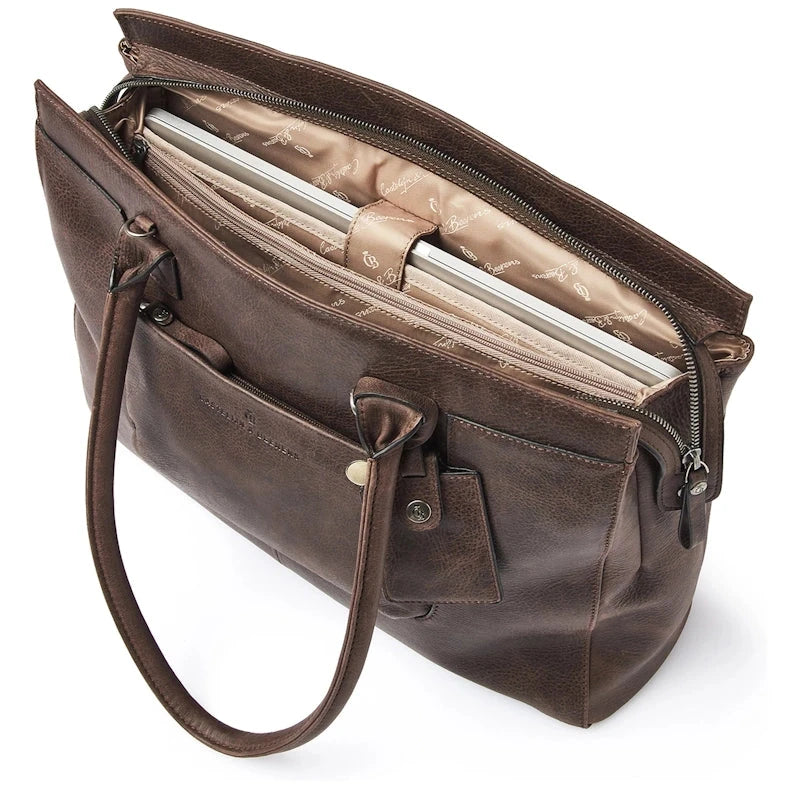 Elegante leren schoudertas met een verstevigd vak voor een 15,6" laptop of Macbook Pro. De laptoptas is verdeeld in 2 hoofdcompartimenten met een groot ritsvak in het midden. Daarnaast heeft de leren businesstas diverse rits- en steekvakken voor persoonlijke benodigdheden en documenten. De laptop schoudertas is voorzien van twee grote hengsels en een afneembare en verstelbare leren schouderriem. Dit is 1 van de 6 modellen leren laptoptassen uit de Carisma collectie, vervaardigd uit soepel Italiaans leder met een natuurlijke nerf.