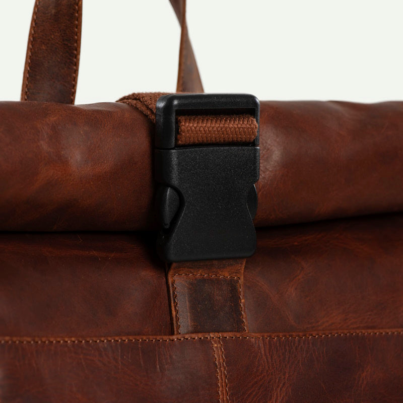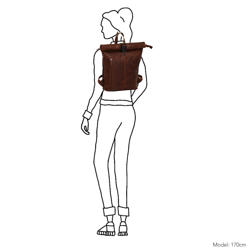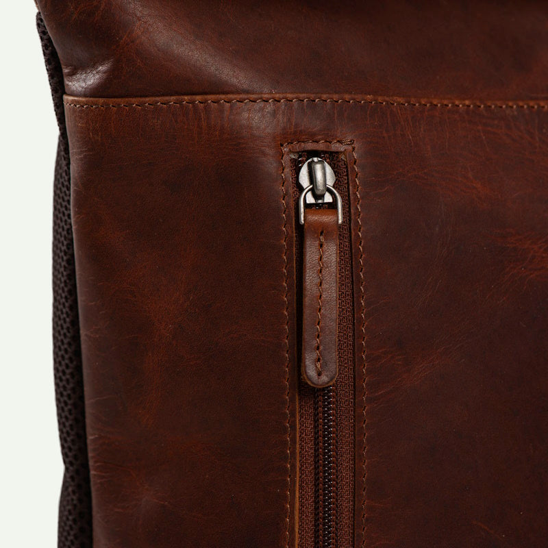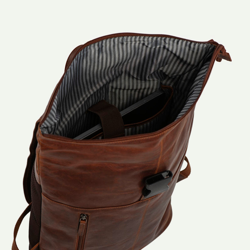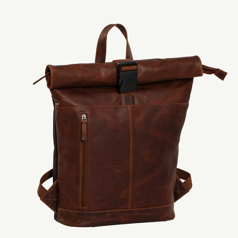 Luxe lederen laptop rugtas van het merk Daniel Ray. De tas is gemaakt van soepel vintage gelooid rundleer. Het ruime hoofdvak is afsluitbaar middels een klik-sluiting en is oprolbaar ofwel qua volume wat te vergroten of te verkleinen. De rugzak heeft een groot hoofdvak met daarin een gewatteerd laptopvak voor een 15,6" laptop. In het hoofdvak nog een klein ritsvak voor het opbergen van kleine spullen. Op de voorkant van de rugzak een ruim ritsvak voor het opbergen van bv. een mobiele telefoon. De rugzak heeft twee gevoerde leren schouderbanden die verstelbaar zijn. Tevens heeft de rugzak een ventileren rugpand en aan de bovenkant een handvat.