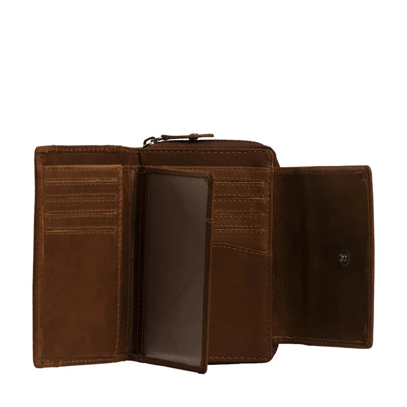 Deze damesportemonnee is gemaakt van rundleder en is zeer functioneel. Deze damesbeurs bestaat uit twee delen: een vak met rits voor muntgeld en een vak met klep met druksluiting waar plaats is voor elf creditcards, waarvan een met kijkvenster. Er zijn twee steekvakken voor papiergeld en nog een extra vak met kijkvenster voor bijv. een foto. Daarnaast bevat de portemonnee nog vijf extra steekvakken. De portemonnee heeft RFID protectie, door de RFID protectie kunnen uw pasjes niet uitgelezen worden. Dit is tegenwoordig onmisbaar nu contactloos betalen een belangrijk onderdeel is van onze betaalmethode.