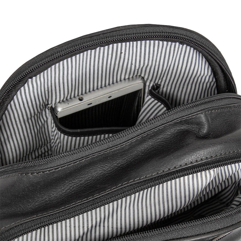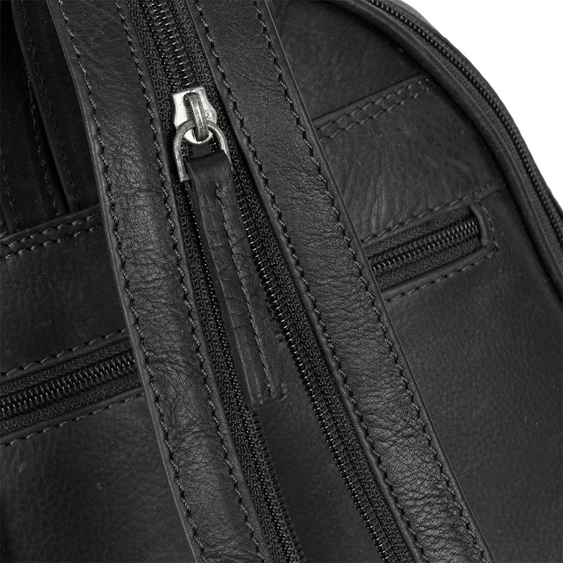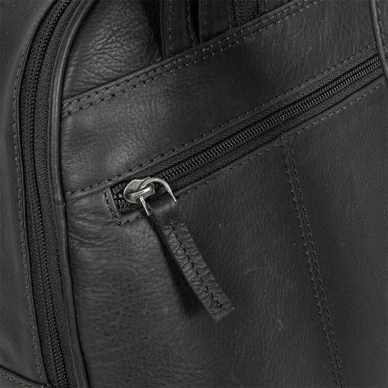 De tas heeft twee hoofdcompartimenten die met ritssluitingen kunnen worden afgesloten. Op de voor- en achterzijde zit een compartiment met rits voor kleine items waar je veilig snel bij kunt komen. In het hoofdvak zitten een ritsvakje en brede insteekvak. De schouderband aan de achterzijde kan gesplitst worden door middel van een rits, waardoor er twee schouderbanden ontstaan voor rugtas-gebruik. Je kunt de tas ook makkelijk dragen als handtas door de stevige leren lus aan de bovenzijde.