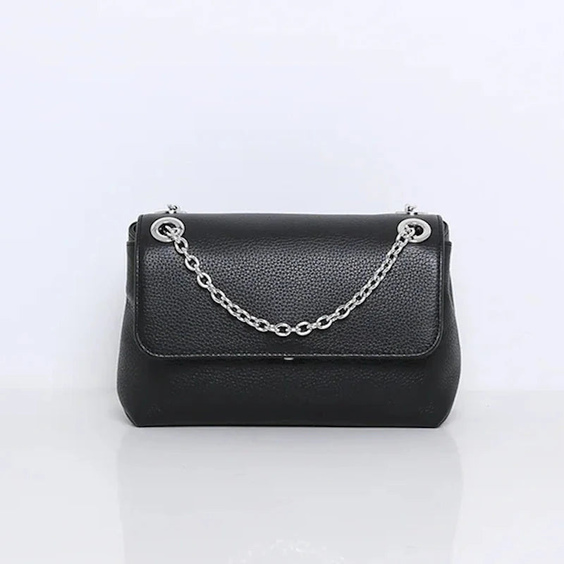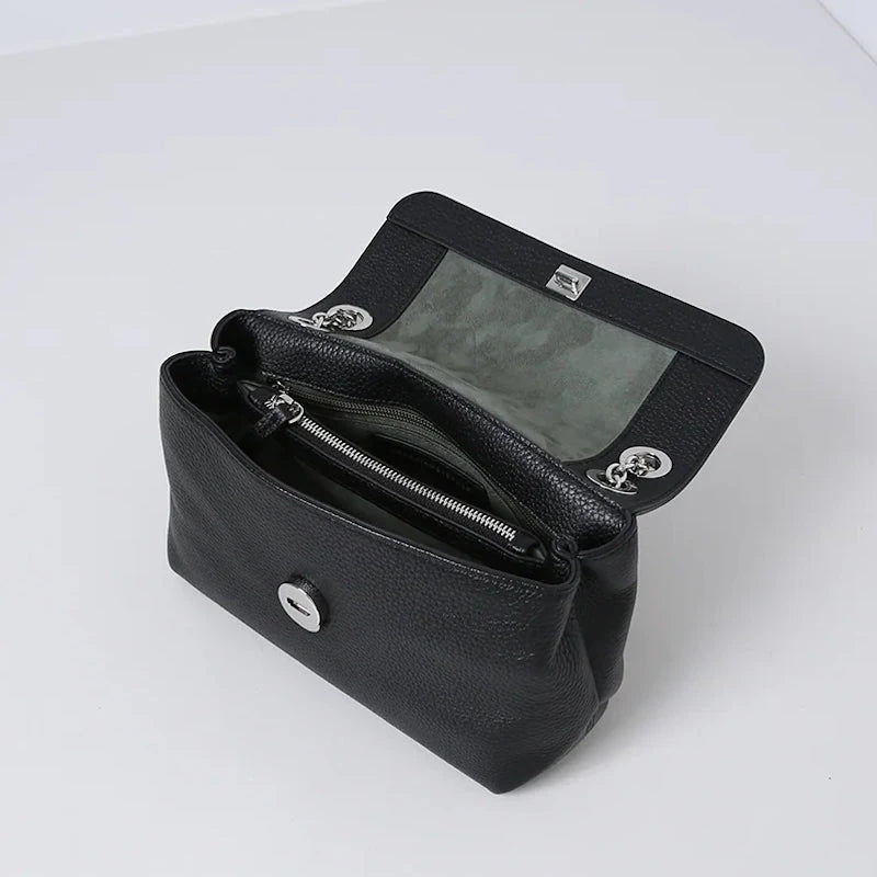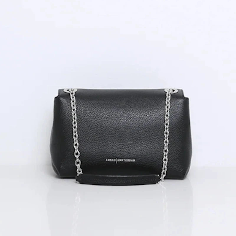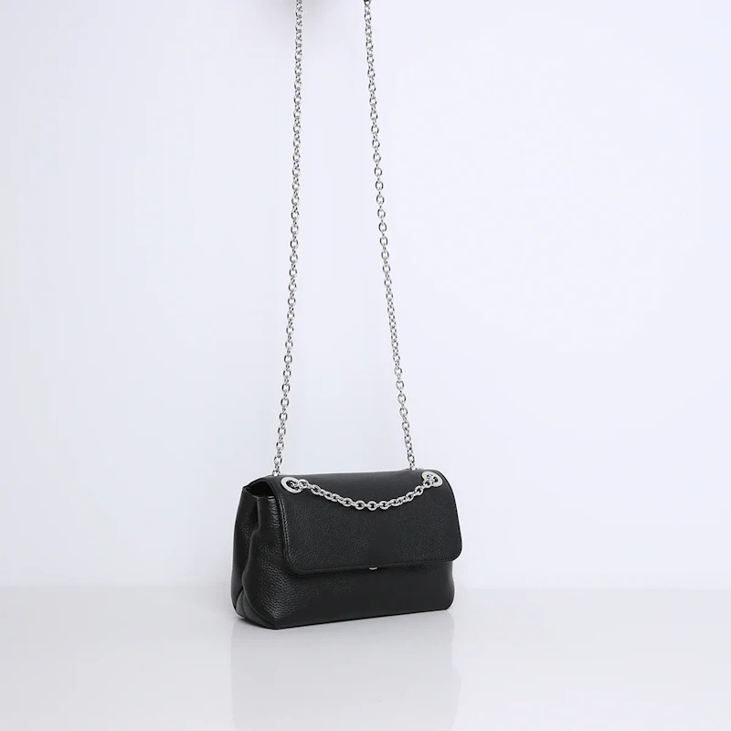 De tas heeft aan de binnenkant twee compartimenten, gescheiden door een middenvak met ritssluiting. Daarnaast beschikt ze over meerdere binnenvakjes en is ze gevoerd met suedine (viscose) materiaal. De tas opent aan de voorkant en sluit met een kliksluiting. Op het middenstuk van de zilveren hardware ketting is de tas afgewerkt met leer, zodat ze soepel en comfortabel op de schouder gedragen kan worden. De tas is gemaakt van zacht en soepel leer.