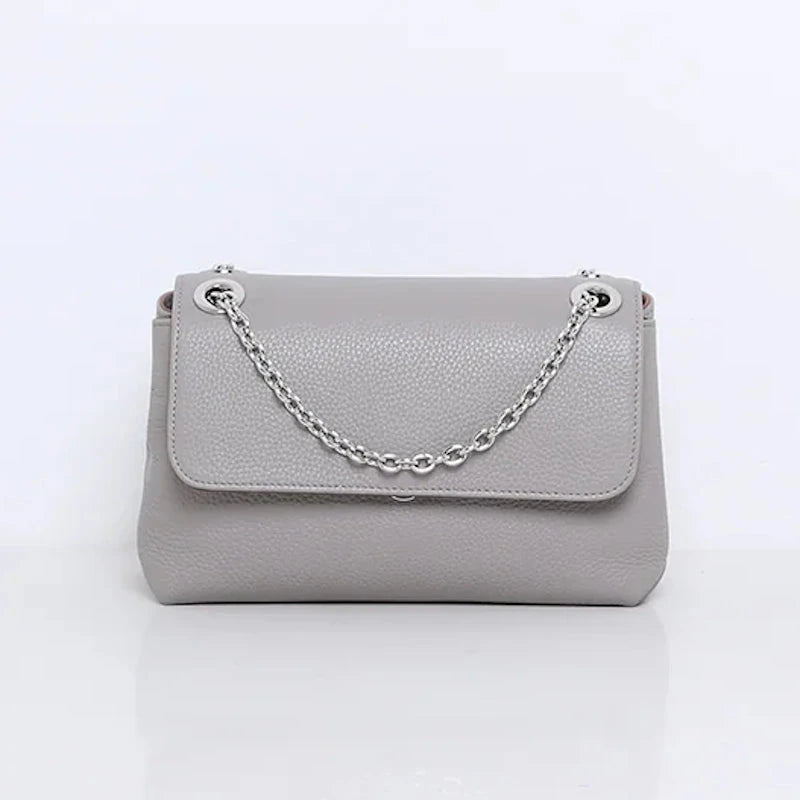 De tas heeft aan de binnenkant twee compartimenten, gescheiden door een middenvak met ritssluiting. Daarnaast beschikt ze over meerdere binnenvakjes en is ze gevoerd met suedine (viscose) materiaal. De tas opent aan de voorkant en sluit met een kliksluiting. Op het middenstuk van de zilveren hardware ketting is de tas afgewerkt met leer, zodat ze soepel en comfortabel op de schouder gedragen kan worden. De tas is gemaakt van zacht en soepel leer.